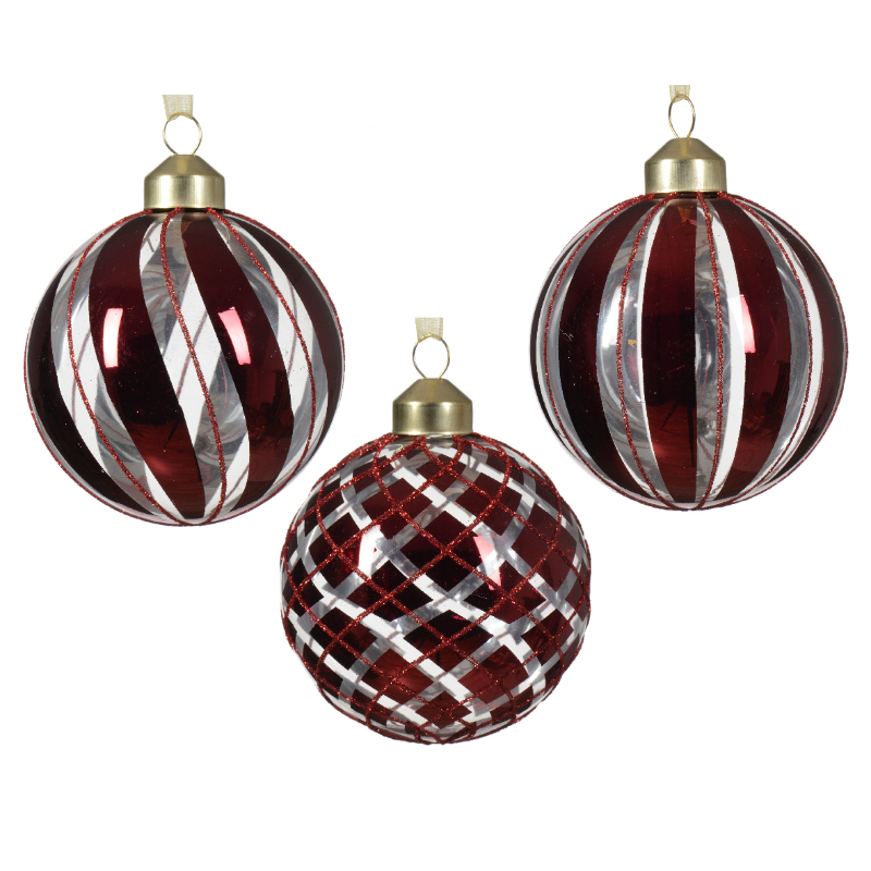 Տոնածառի ապակե խաղալիք, oxblood, ուղղահայաց և զսպանակաձև գծերով, 8սմ/Տուփ 12 հատ/