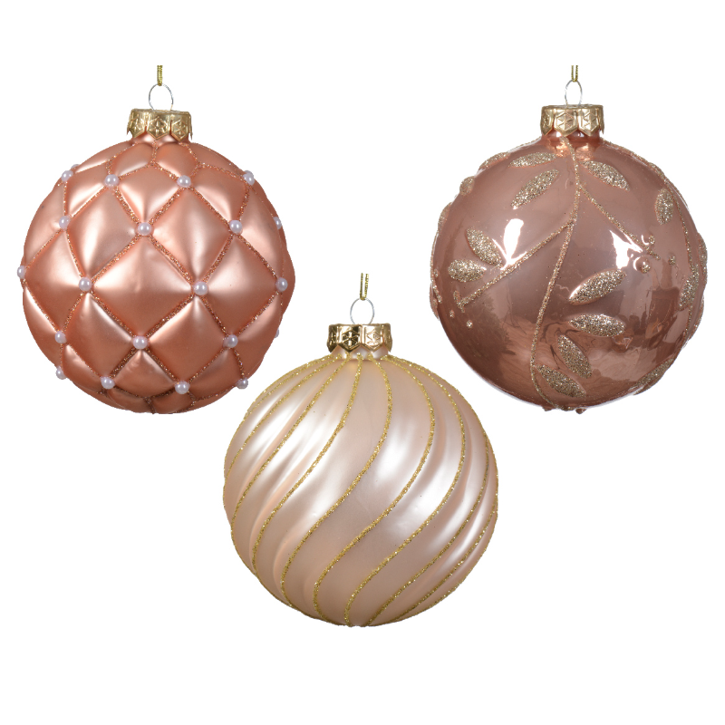 Տոնածառի ապակե խաղալիք, pearl/sparkling rosé, նախշերով, 10սմ/Տուփ 12 հատ/